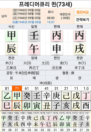 보면 1974년부터 매니악 Maniac 한 팬들의 인기운도 들어오며 사업적인 금전운도 들어오고 끼를 최대로 발휘할 수 있는 힘이 들어옵니다. 3가지가 동시에 들어오네요. 1~2년 정도 빨리 창업(?) 한것 같지만, 그래도 거의 시기를 잘 맞췄네요. 같은 생일의 사주인 사람이 많겠지만, 이렇게 시기를 거의 잘 맞춰서 잘 써먹는가, 아님 들어온 운을 못알아보고 그냥 흘려버리느냐에 따라 성공이 갈리는 것이 아닐까 싶습니다. 동일 사주중에 주어진 한정된 자원을 가지고 가장 사주를 잘 살린 사람이 이렇게 프레디 머큐리 같이 유명인이 되는것이죠.