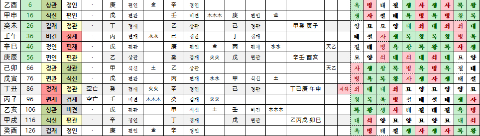 대운 사주 운명 매트릭스를 보니 일평생 재물운 속에서 살아가는 사주네요. 하지만, 그 돈을 크게 벌어들이는 시점이 있습니다. 이 시점을 놓쳐서는 안되겠죠. 그런 의미에서 늦는거보다는 좀 빨리 창업한게 차라리 나았다고 할수 있겠습니다.